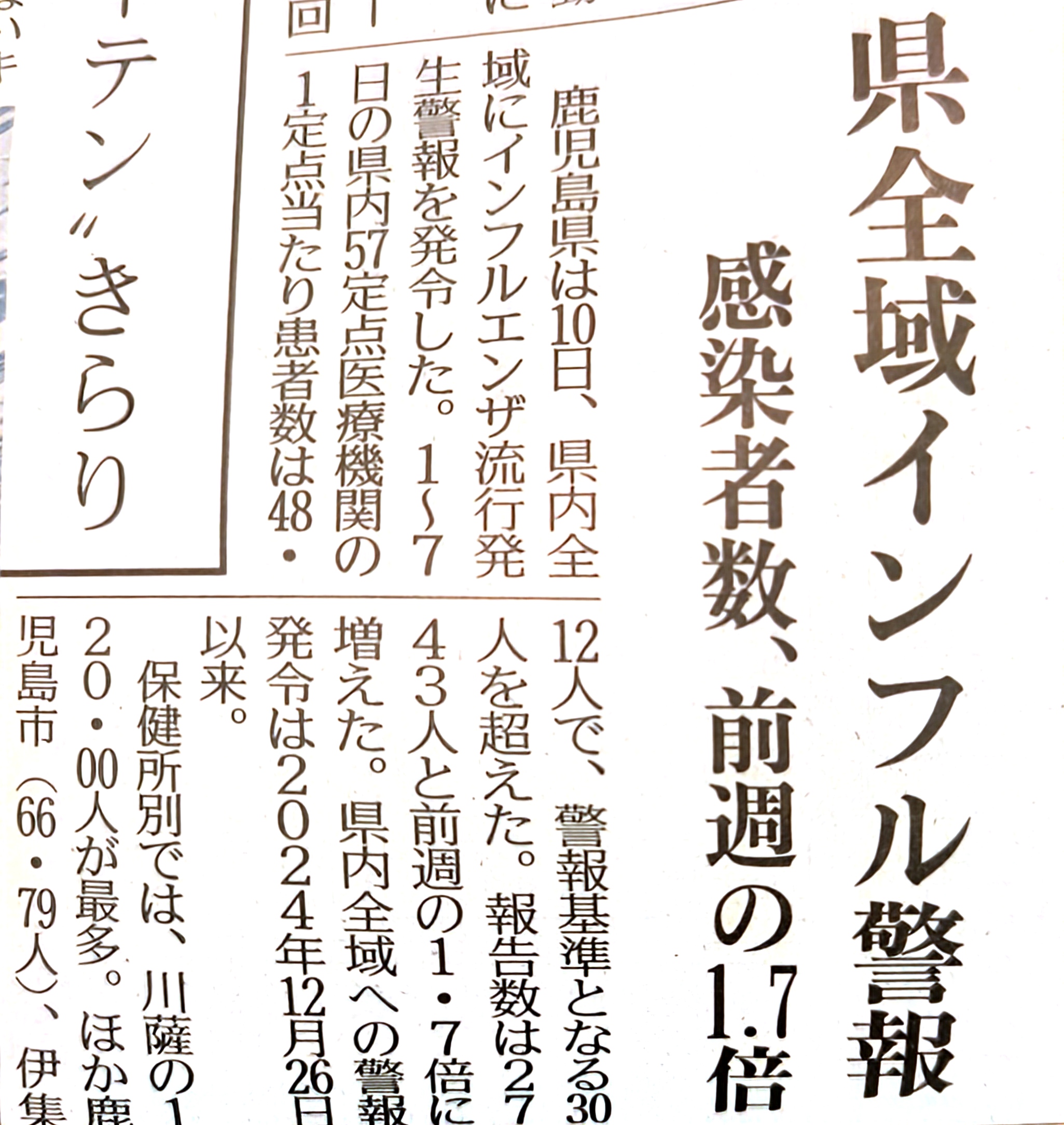 鹿児島県は10日、県内全域にインフルエンザ流行発生警報を発令しました。